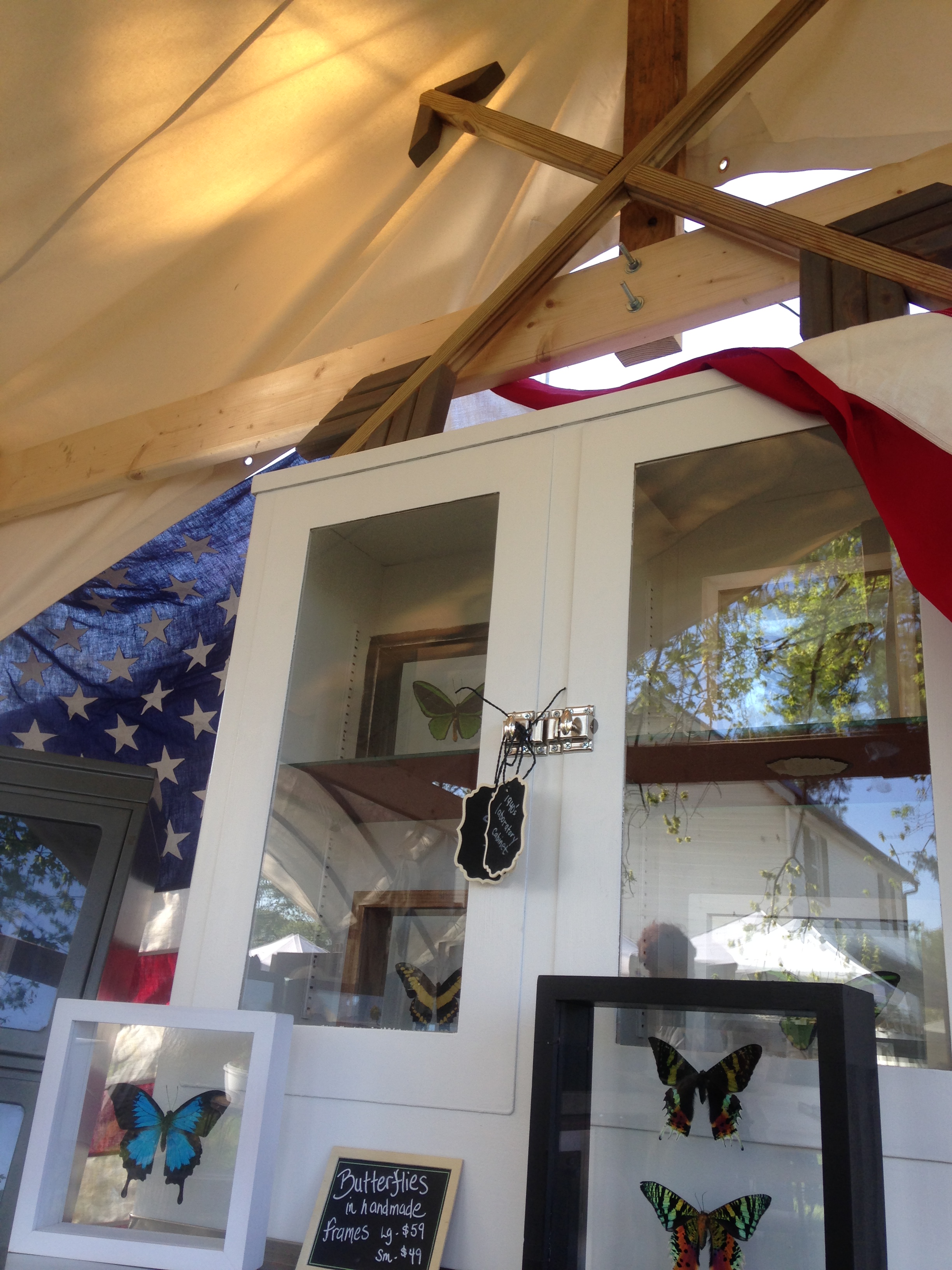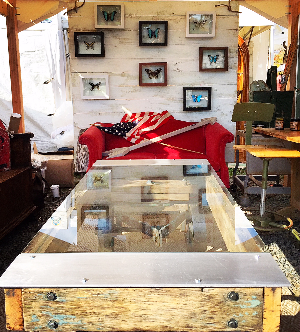 Our garage workshop is busting at the seams, so we end up storing many of our finished products in our house, which creates quite a dilemma because I usually want to keep them! This past weekend we had the pleasure of setting up our pop-up shop at Lucketts Holiday Market, where our goal was to make our small space feel like a cozy living room filled with cool things. Ben finished up another awesome cart table in time for the market, and we filled the space with drafting tables & stools, a cute little red velvet vintage sofa, a sweet antique bench, cool old pulleys & other primitive pieces, and, of course, our handmade butterflies and lamps. We started off the weekend wondering how we would fit all of our treasures into such a limited space, and by Sunday, we were challenged with keeping our space from looking empty!