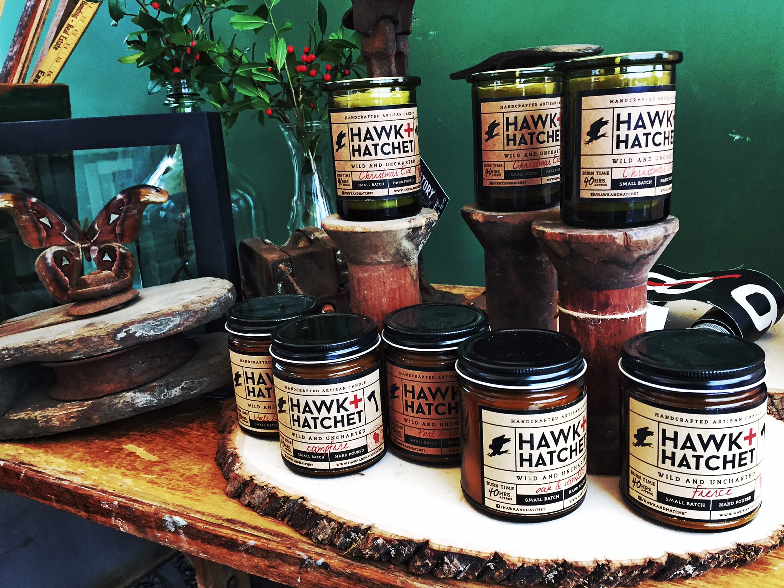 I always want my house to have candles and fresh flowers – so, since we wanted our shop to reflect things we would want to feel like home, we searched for a while for a candle maker whose aesthetic was a fit with ours. Brian at Hawk & Hatchet hand pours delicious flavors like Campfire (really smells like a campfire!), Uncle Lloyd’s Pipe, Christmas Eve, and Vanilla & Oak, just to name a few. Check out his etsy site to order direct and check out other scents, or catch us at our next pop up! As for the flower requirement, we did not have a florist on call, so some holly branches from my backyard had to do.