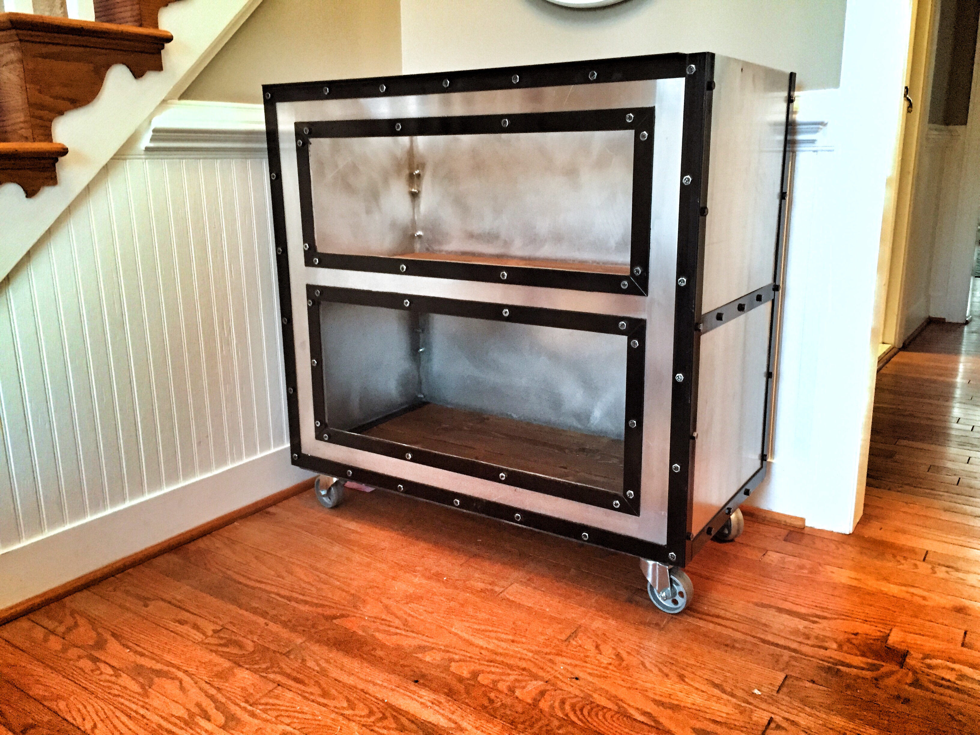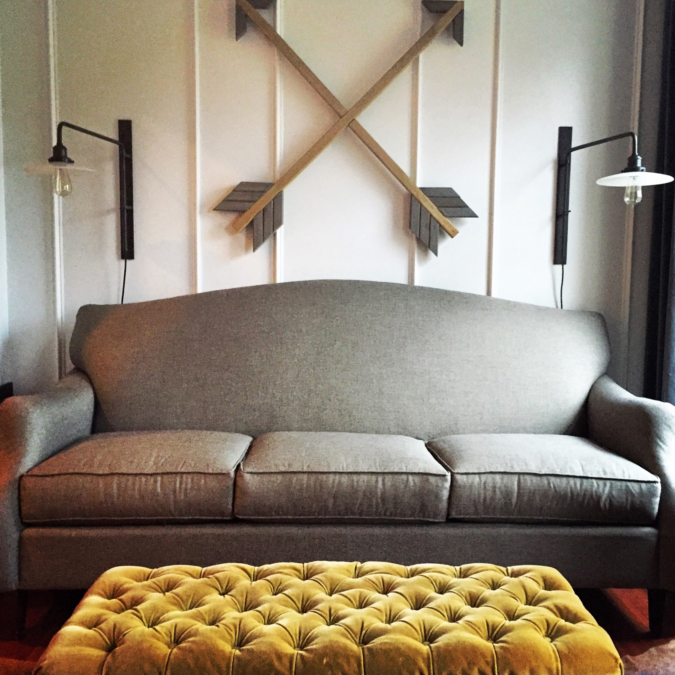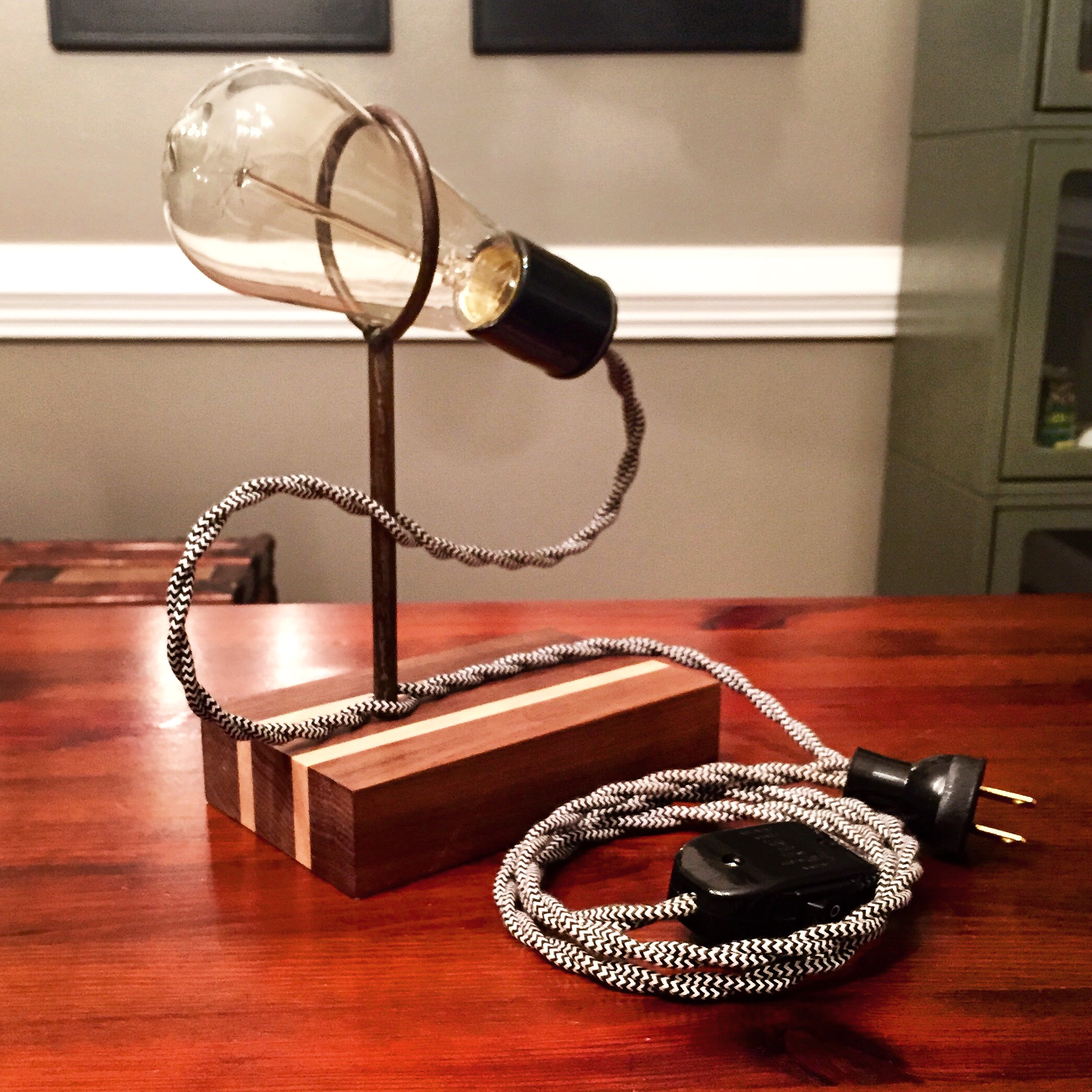 Versatile lighting with an industrial modern look. Can be a table lamp……Or a unique and easy-to-hang sconce. They look awesome as a pair on either side of a couch or bed, or alone as a point of interest.I think she likes it.Crossed arrows handmade from reclaimed deck wood.Vintage AmericanaSide view of one of the finished cartsTools of the trade.Sweet Hamilton drafting table and chair128 bolts. 256 holes drilled. 200 lbs of aluminum, steel, and pine. Maple butcher block top still to come!Our library, featuring Ben’s latest creation – a 100 year old industrial cart turned table – and, of course, our bug collection.Sitting room.Butterfly drying and spreading processBirdwing butterfly on one of our handmade floating glass frames.This guy is always looking at me when I am trying to get work done…Got our hands on two more giant industrial carts — the demo begins.Cart after rotted wood was removed, frame shortened, power-washed and sanded. I love the hand-hewn cross beam in the middle.Decades of paint and years of weatheringI think I have a chair addiction. I’ll be polishing these up for our market this Spring.