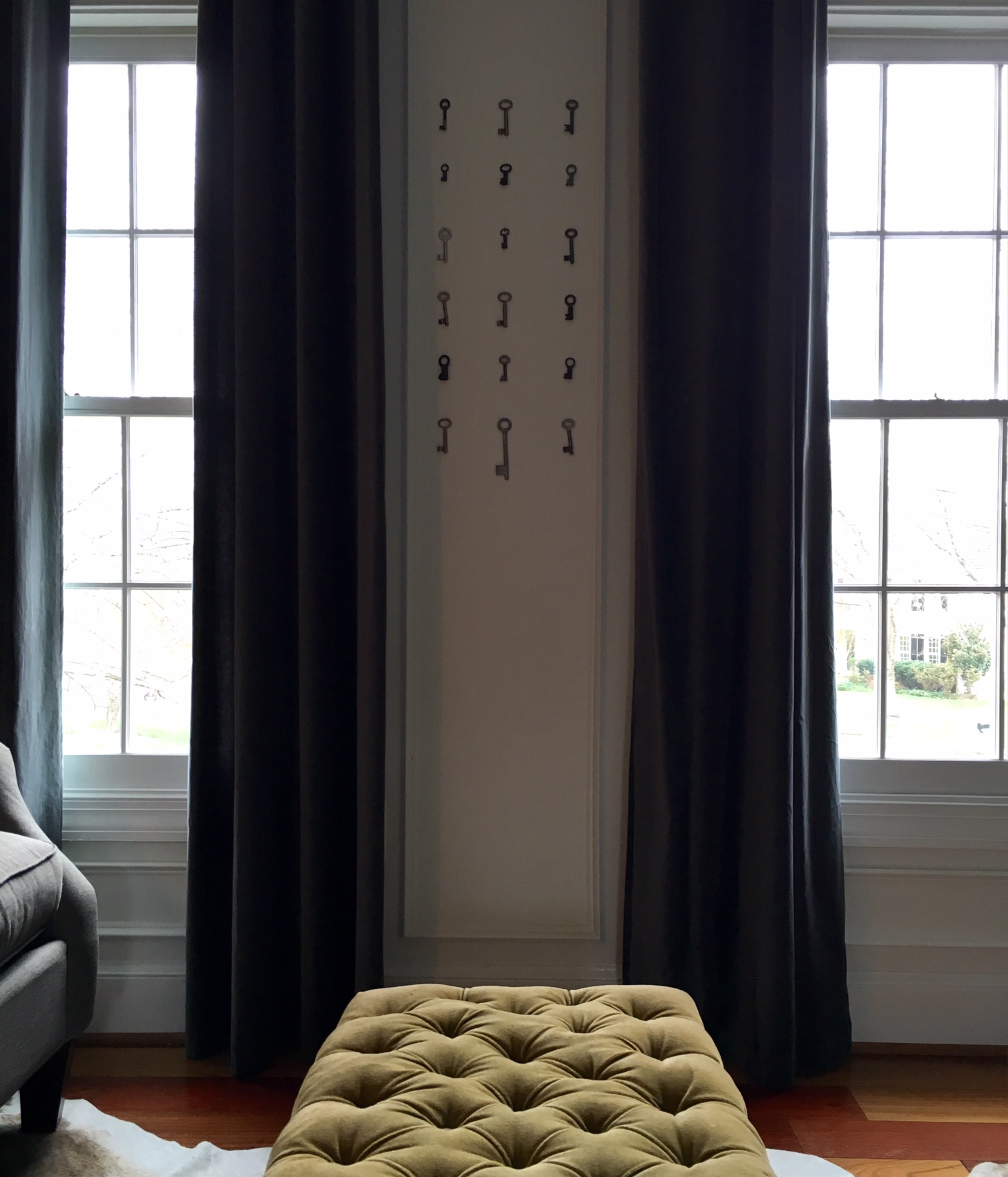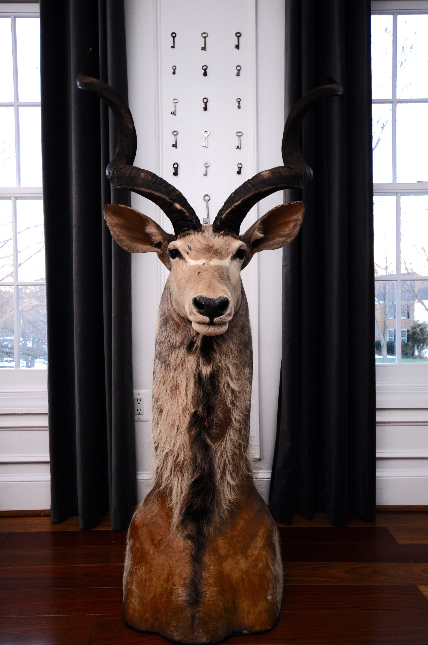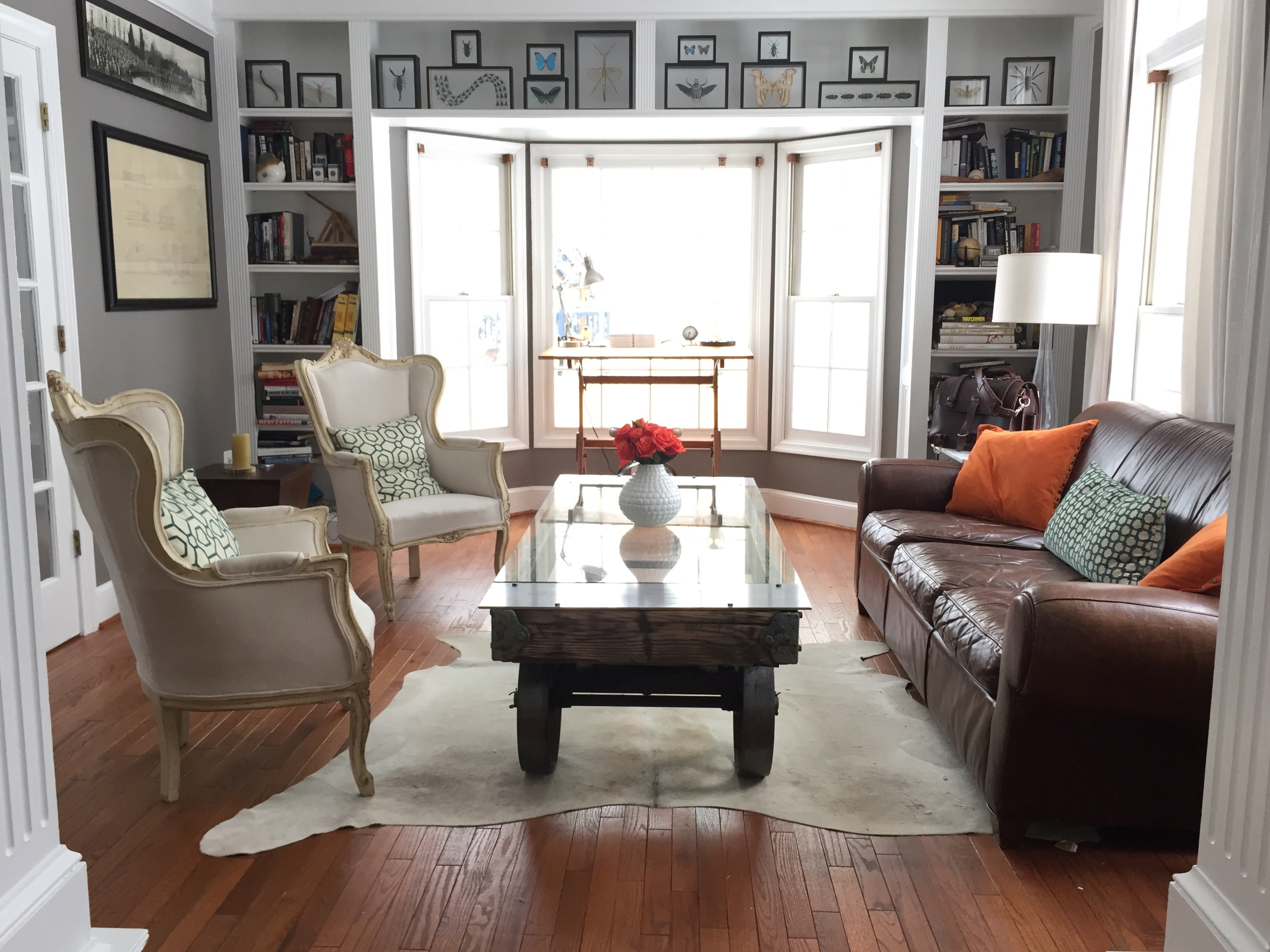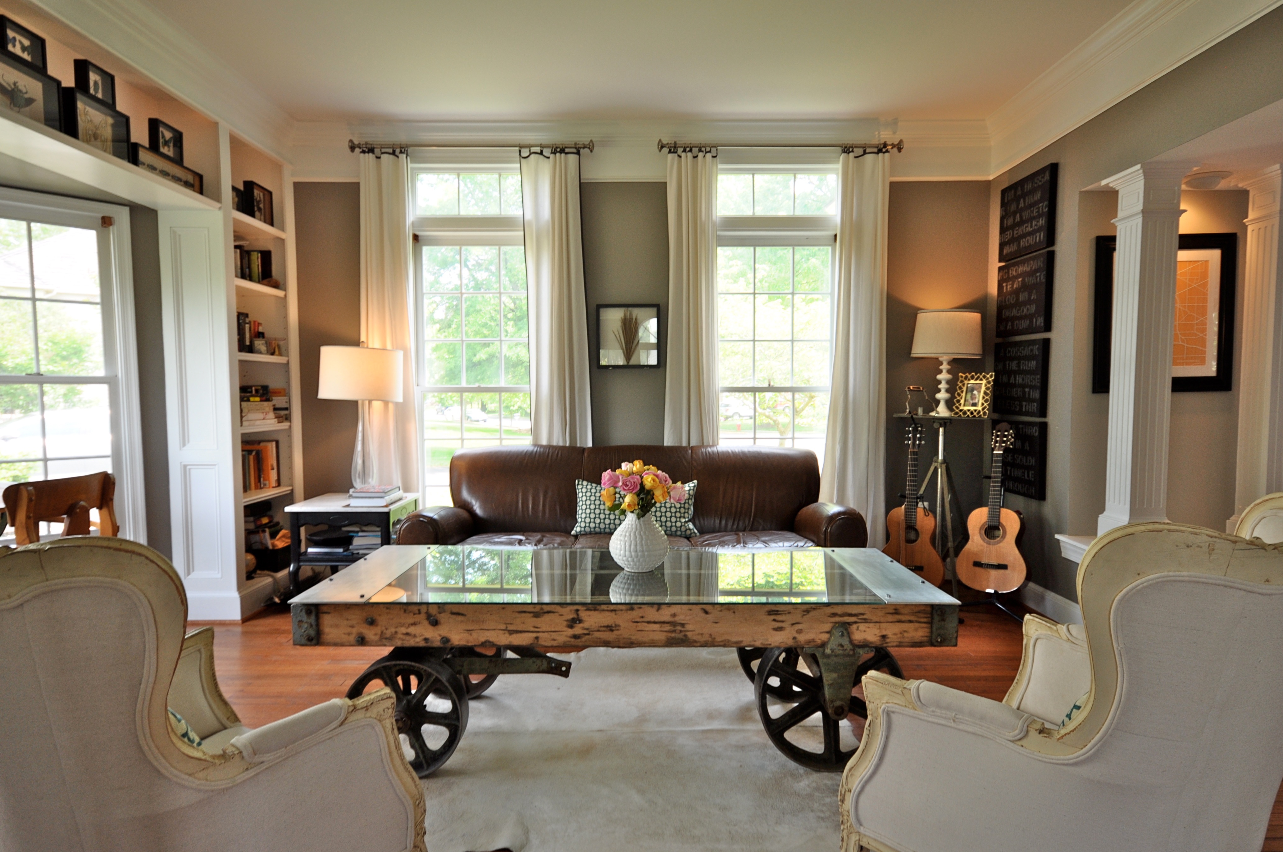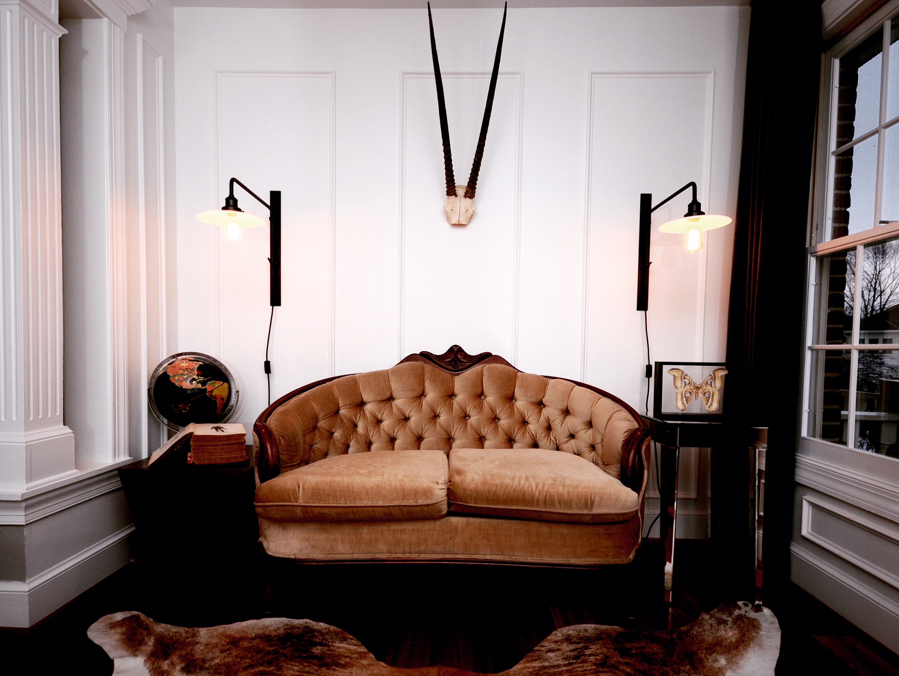 Vintage sofas and our beloved kudu anchored our design for the Cottage at Sweet Clover.