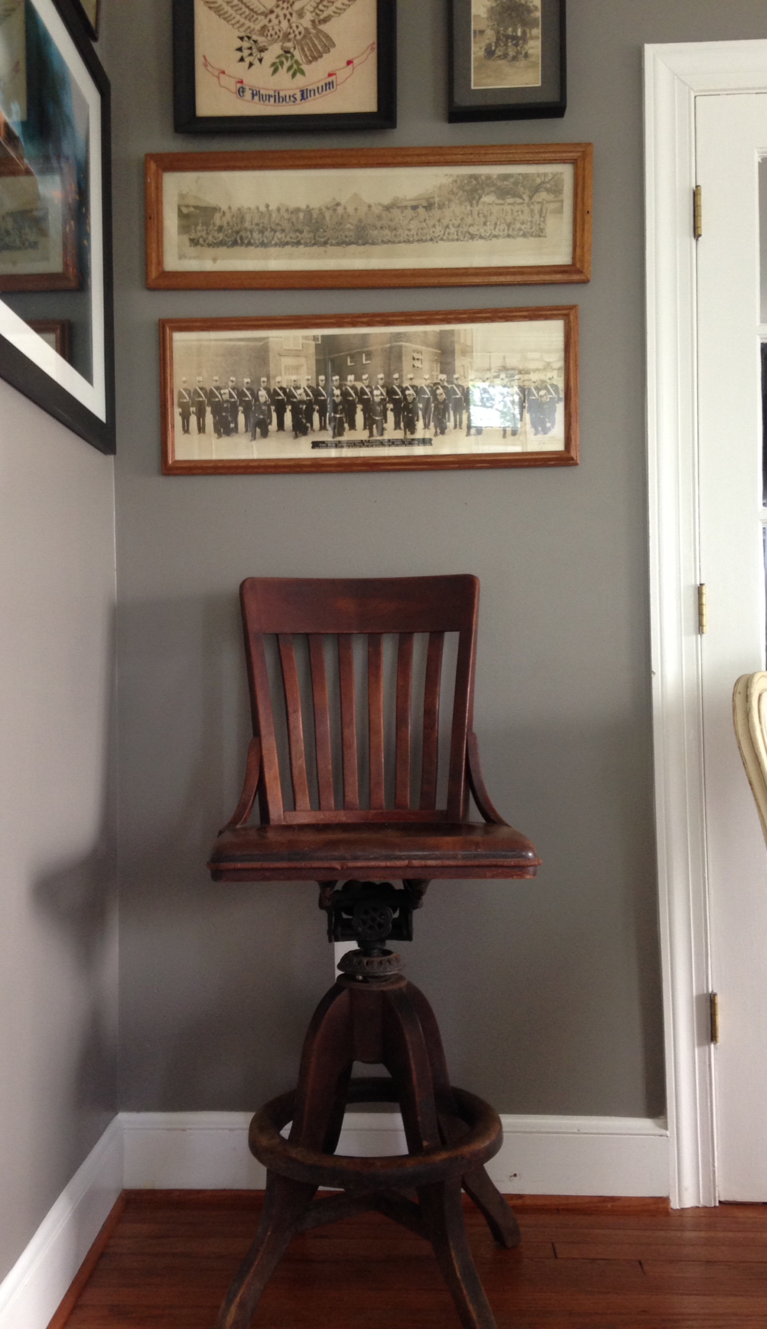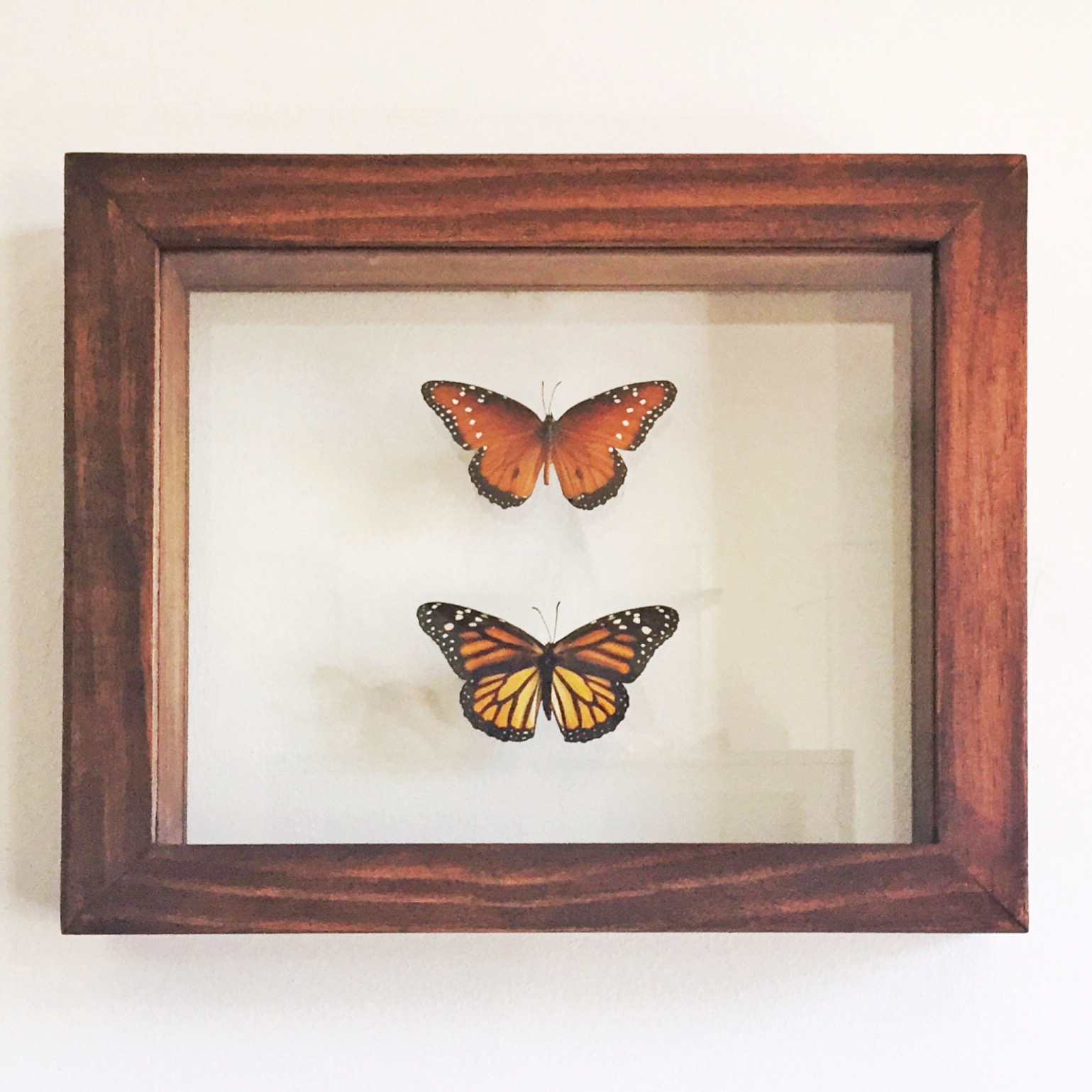 Two views of our studio – after painting the previously purple and gold room a beautiful soft white. We love having a place to work where we can display our collections, including our vintage military photos.Awesome Art Deco style hair dryer from the 1940’s converted to a lamp.Recent pop up shop featuring one of our sweet cart tables.Collection of German aluminum keys from WWIICustom order of 48″ pine and walnut arrows atop a primitive cabinet.Lovely custom framed butterflies ordered for a birthday gift from husband to wife.We transformed the cottage at Sweet Clover Barn into a vintage library.