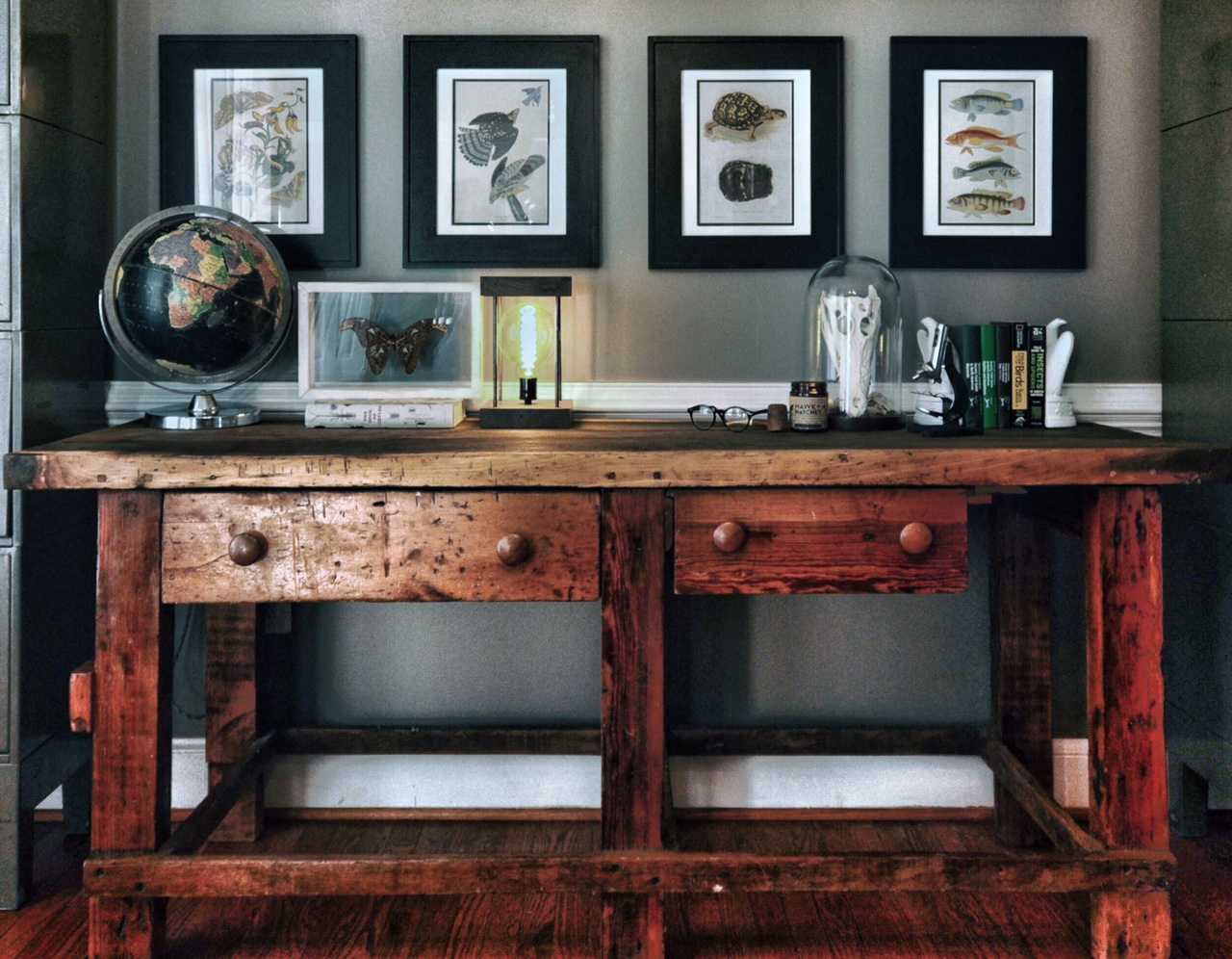 Inspired by an antique bug zapper spotted in Italy, one of Ben’s latest lighting projects.One of my favorite new lighting creations – triple dome light on handmade walnut, featuring a Crooke’s radiometer that spins when the light comes on.Giant Atlas moth in handmade walnut frame. This same walnut is being used for table tops in our workshop. It was storm-felled locally and has such beautiful grain that it does not even need stain.Busy day of spreading and drying these lovelies.Recent commission – walnut and pine base with hand-forged steel rod and vintage cloth cord. Edison bulbs make everything cooler.Picked up this great cowhide rug at at Texas flea market, and this velvet tufted bench at a barn sale — sorry, these are keepers.I have a weakness for vintage drafting tables. And vintage drafting stools.Love this iron detailing.Great iron and solid wood counter-height vintage chair.Rustic collection of large vintage buoys found at a local estate sale. Perfect for a lake house or nautical designed space — in the shop soon!So this baby needs a little TLC, but the wood grain and claw feet would not let me leave it at the garage sale. She’ll be lovely in someone’s entryway once all cleaned up. The seat opens up for storage as well.Sample table lamp from our new line of lighting. Recycled butcher block base with vintage-style red cord.